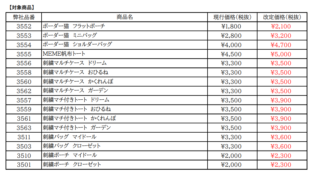 ※仲良し猫、スマイル、価格改定対象以外の刺繍シリーズは在庫限りで完売になります。