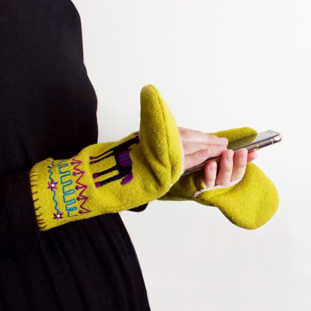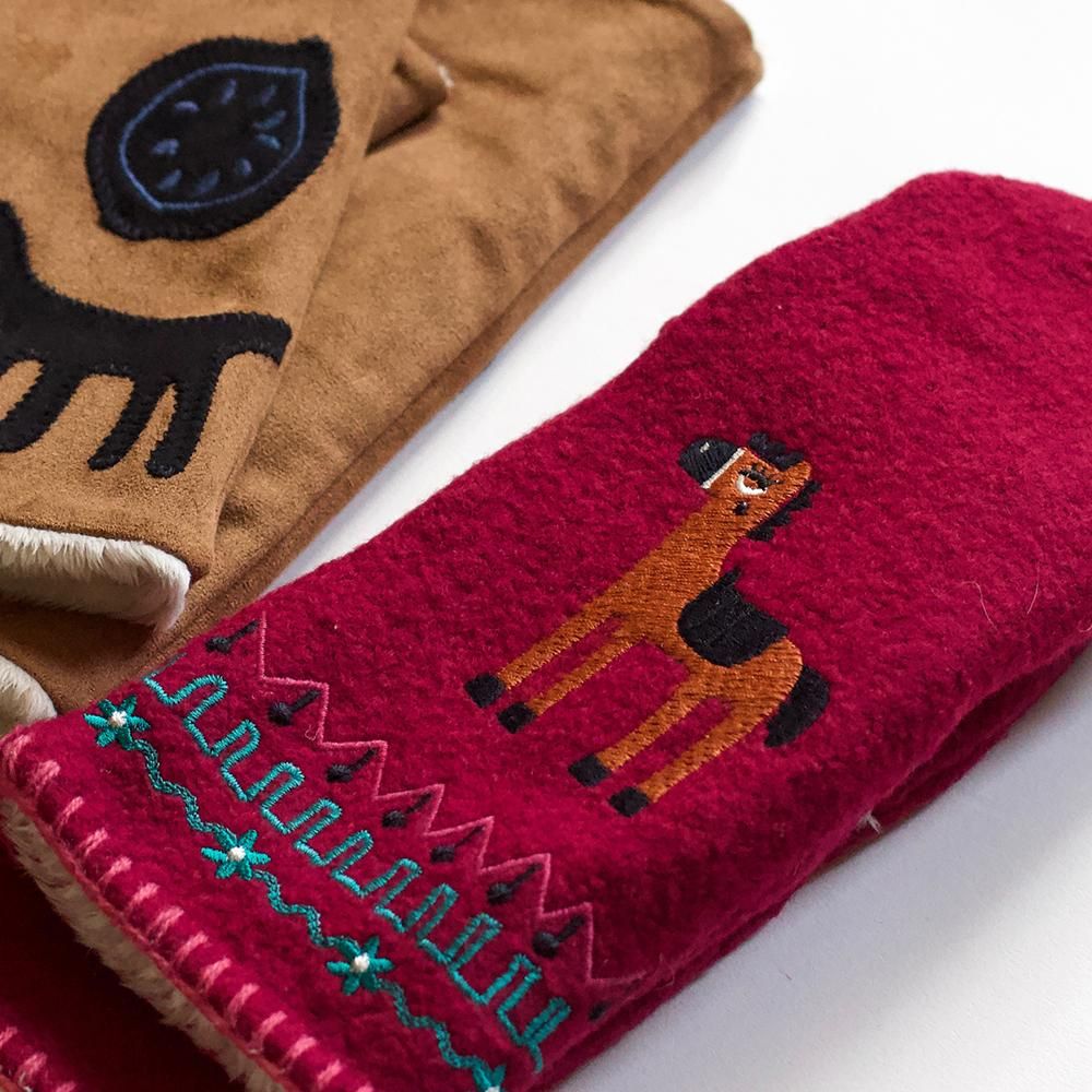 贅沢な刺繍で描かれたポニーがなんともキュート♪ 華やかな中にも大人っぽさのある色使いや、民族調のステッチが魅力的なミトンが登場です。 こだわり抜いた刺繍糸と生地の色合いが絶妙で、暗くなりがちな冬のコーデの差し色にぴったりですよ♪