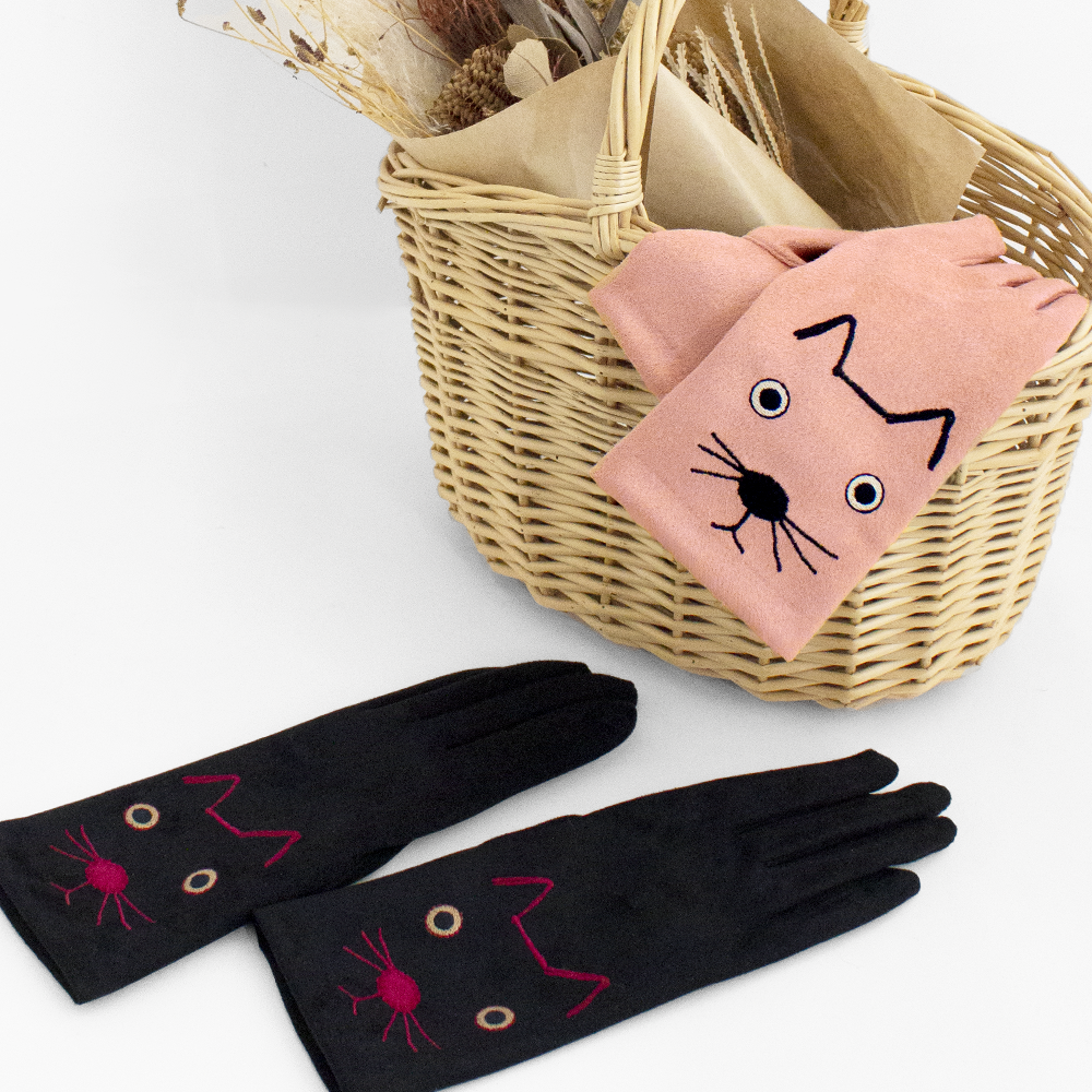 シンプルで大人っぽい形の手袋に、素朴な猫の顔を大胆に刺繍しました。
