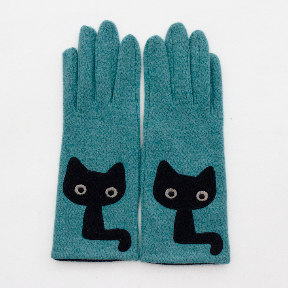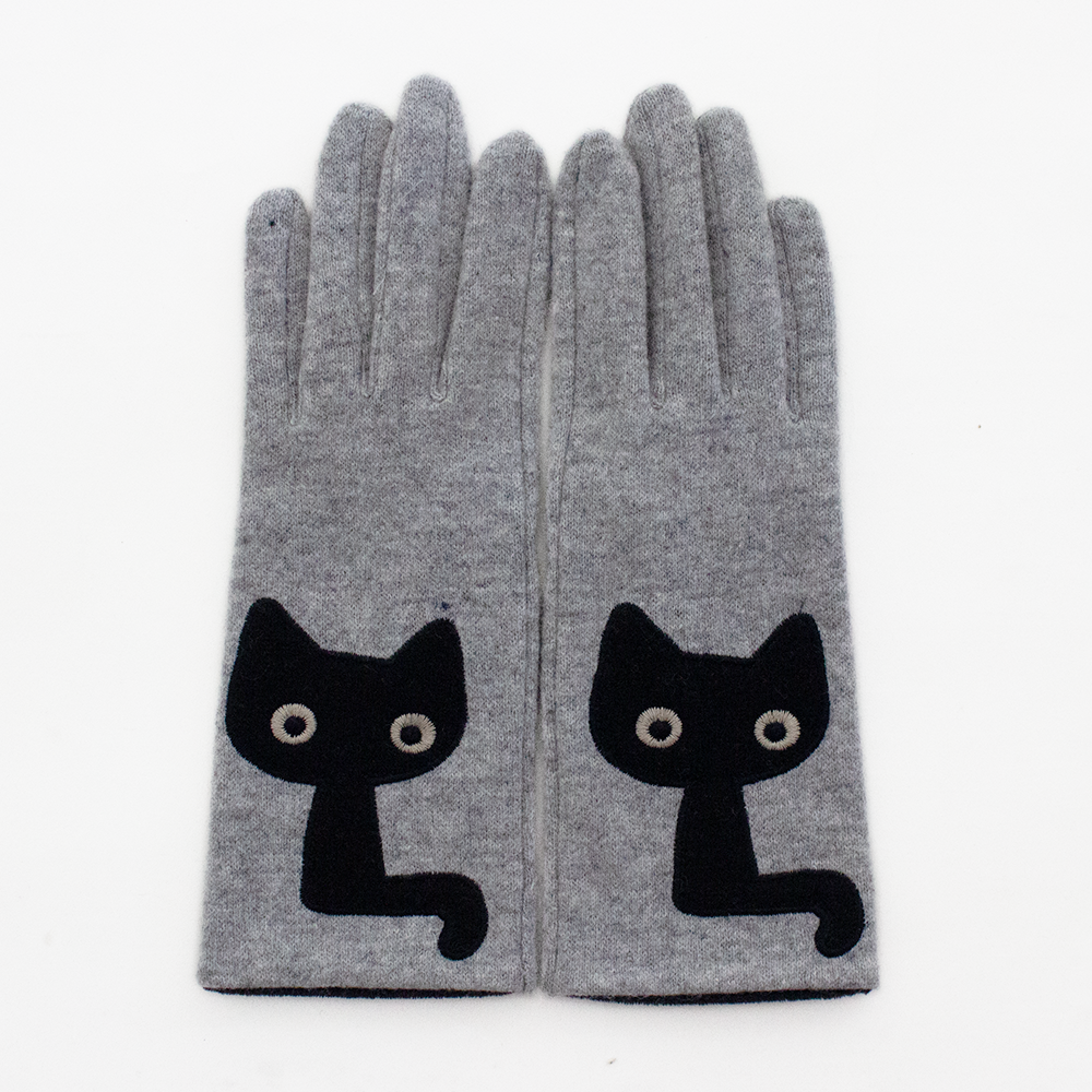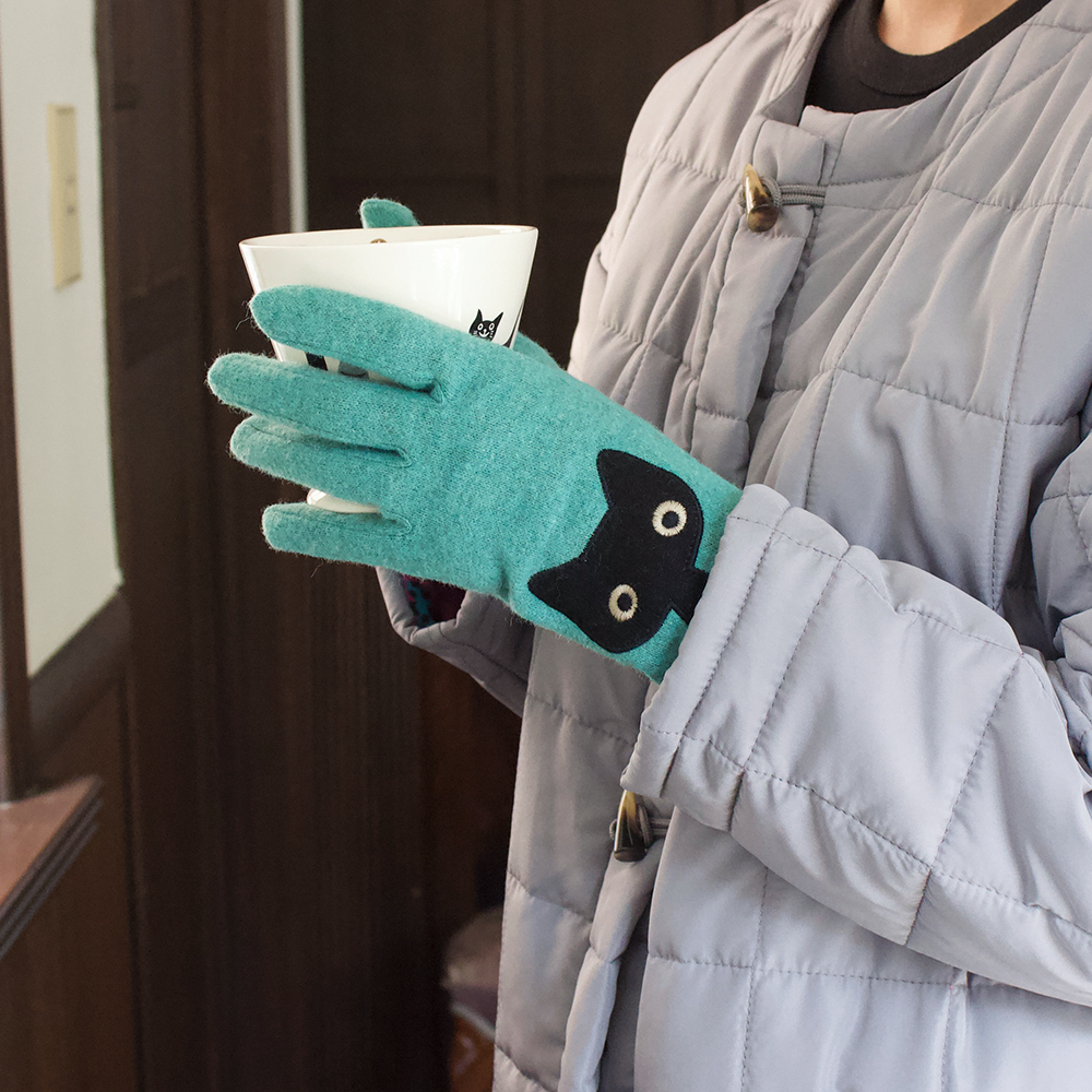 すっきりとしたデザインに大きな瞳の黒猫のアップリケが映える手袋です。