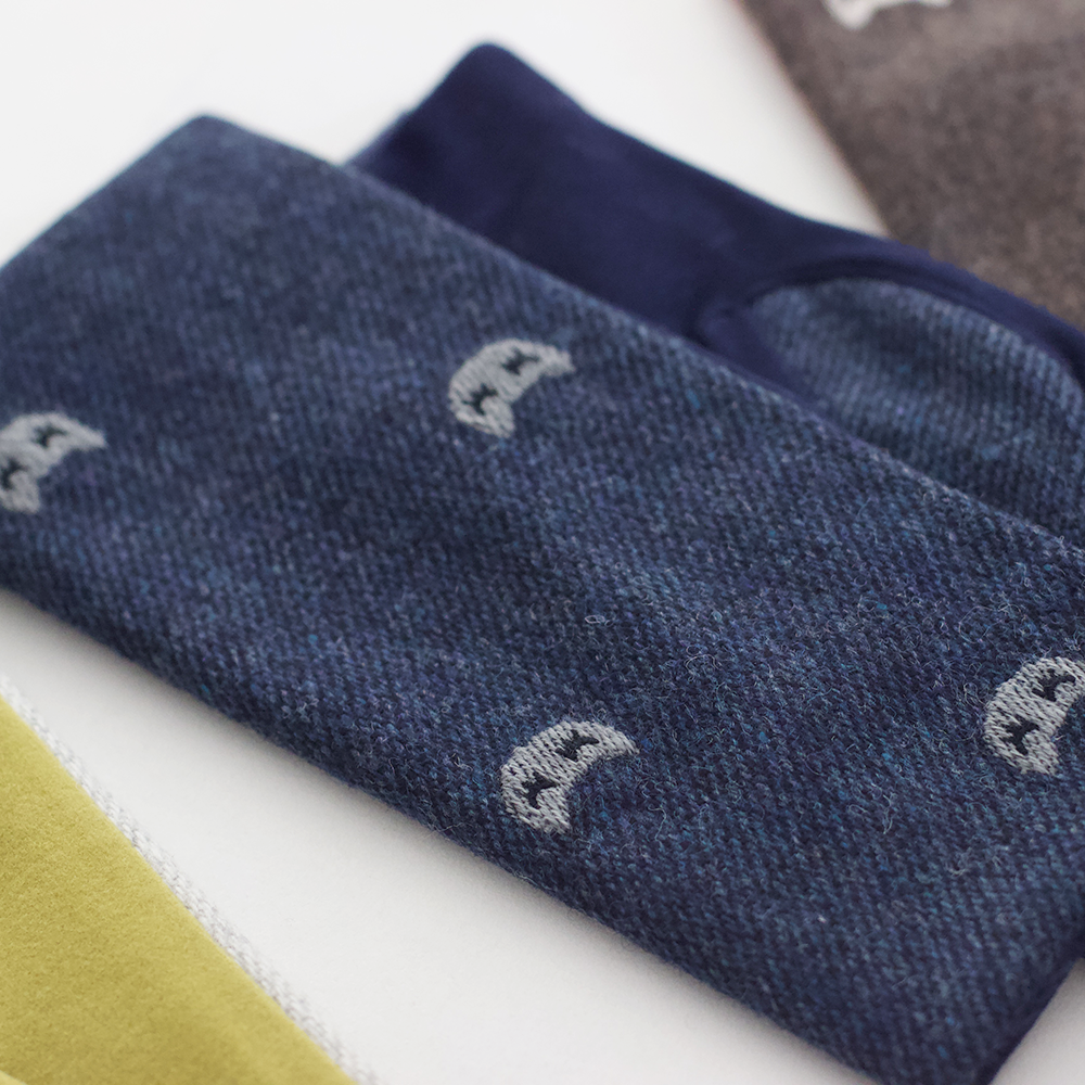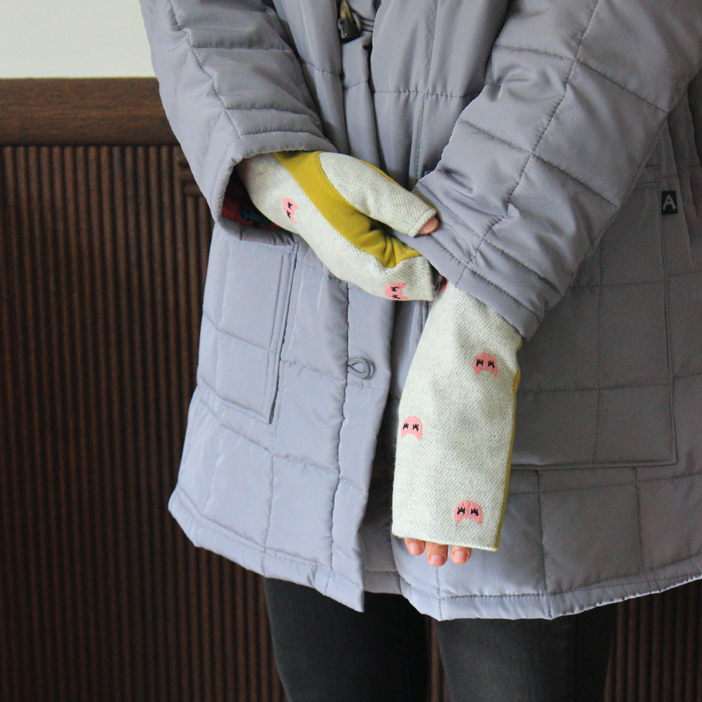 目を閉じた表情がなんとも愛らしい「mew」♪ さりげない小さな刺繍が、ナチュラルな可愛さを演出します。 手の甲と掌で、それぞれ違う生地を使用しているいて、バイカラーのおしゃれな雰囲気を楽しめます。