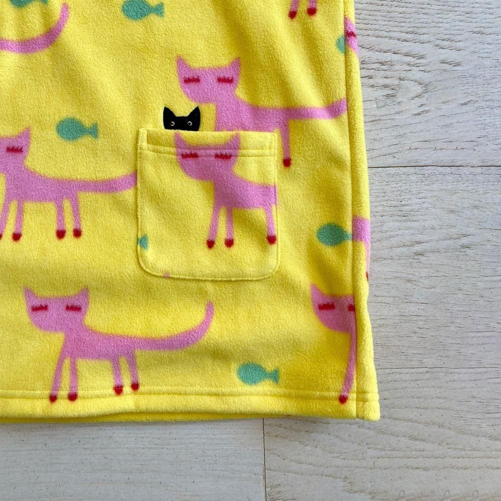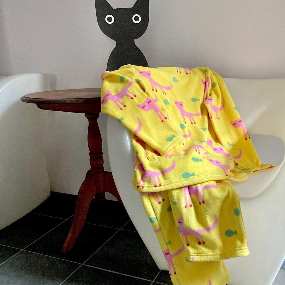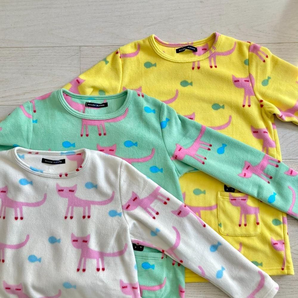 長いまつげの猫ちゃんが優雅に歩く姿が可愛い、ガーリッシュな「まつげ猫」のパジャマ。 ひょこっとポケットから顔を出す黒猫アップリケで遊び心も忘れません♪